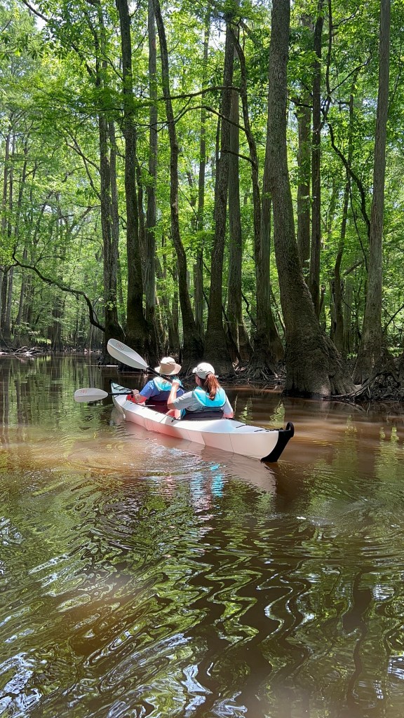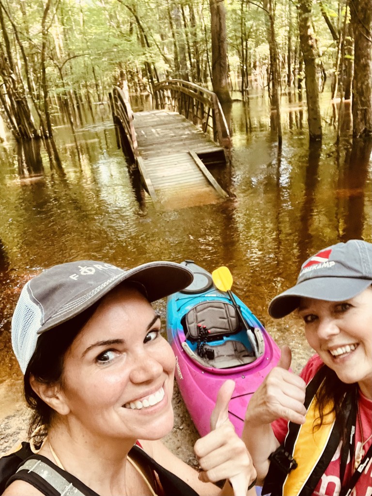 One of my biggest fears is that a snake will fall into the hull of my kayak. I am also very afraid of alligators. People love to send me videos of kayakers encountering alligators who slap their boats around with their big tails. So until this year, I had avoided kayaking the beautiful black water swamps where poisonous snakes sleep overhead in the canopy of trees and alligators sun themselves on the muddy banks. I casually suggested to my best friends since childhood that we do it, thinking that they would decline and say that I was a cool and adventurous fool – and that affirmation would further secure my role in our group as the fun one. Surprisingly, though, they jumped at the idea.