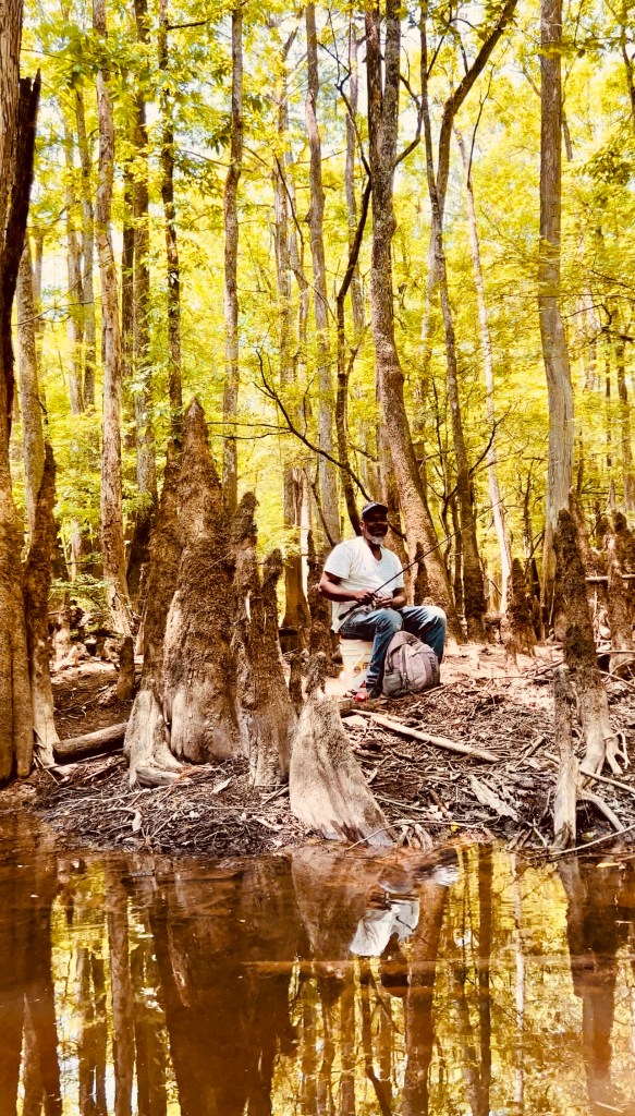 So in the heat of late June, we met at Congaree National Park, camped at Longleaf campground, packed up our tents, made coffee over a fire, and then took kayaks out to the Cedar Creek Boat Landing for a slow water paddle through the majestic cypress trees. We encountered a few canoers, a couple of adventurous women (one of whom had a hole in her boat and was taking on water – and we had nothing that could help), and we had a few short conversations with fishermen on the banks who seemed to have life pretty much figured out.