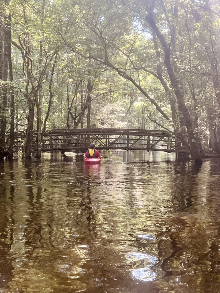 Want to go? Click here to learn more about Congaree National Park. We accessed the black water swamp through the South Cedar Creek Canoe Launch, which is located south of the main entrance to the park. The address for GPS is just South Cedar Creek Road and you’ll be driving for a while, bound to think you’ve missed it. On normal days, there are several stairs down to the launch. You’ll also have to carry your kayak down some uneven, although mostly gravel, terrain. There are also vault toilets near the put in. Always bring a life vest and water. Put on bug spray before arriving because this is home to one of only three species of synchronous fireflies in the world and bug spray threatens their habitat. And try not to bang into trees because snakes like to sleep in them and you just don’t want to startle them awake – especially when they’re above your head!